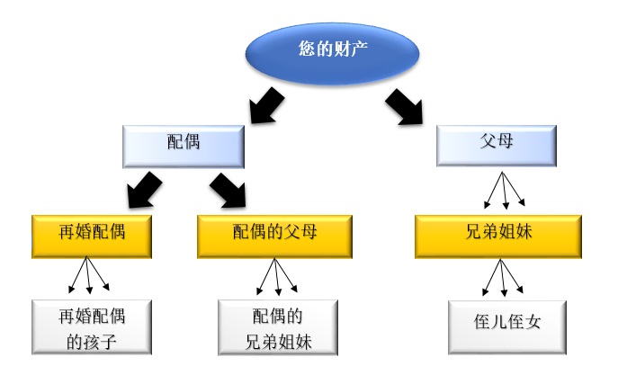 - 死者的父母在死后可能会把遗产继承给死者的兄弟姐妹,然后再传给他们的孩子(即死者的侄子和侄女)和